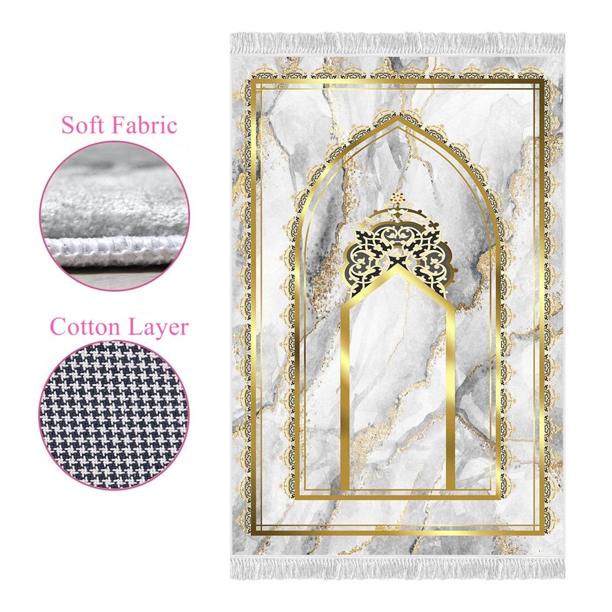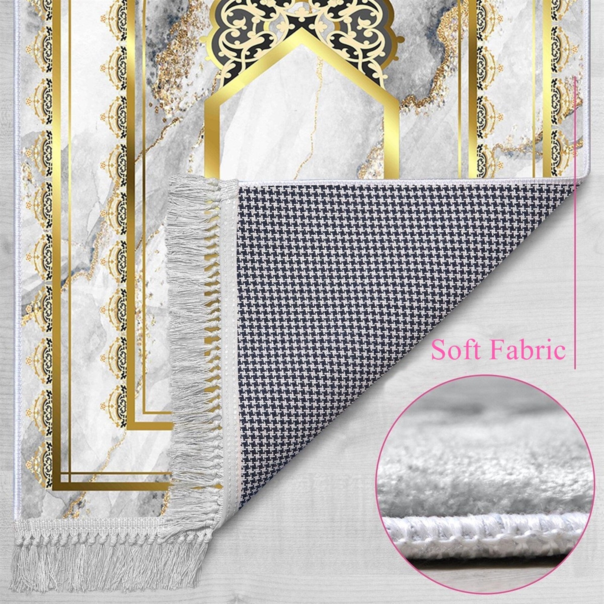 -This Prayer Rug has a soft thick comfort feel of the velvet-like fabric. It is thicker and bigger in size than a regular prayer mat and more like a carpet prayer rug. The entire back of this prayer mat has a no-slip grip, which ensures that the mat stays put on any type of surface.