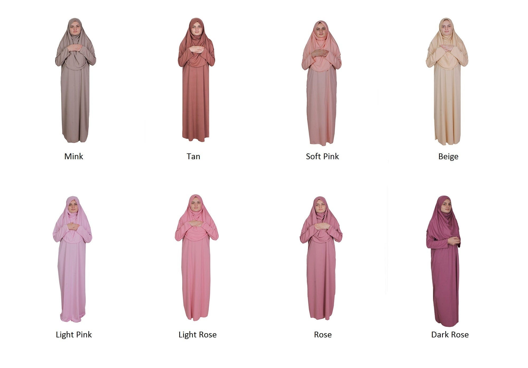 The one piece prayer abaya with a wide headscarf and round neck dress that covers the neck, shoulders and your body lines. It's a practical option for you to quickly prepare for prayer and save your time. With its flexible lycra fabric and comfortable fit, you can choose the prayer dress, which you will love to use, with different color alternatives.