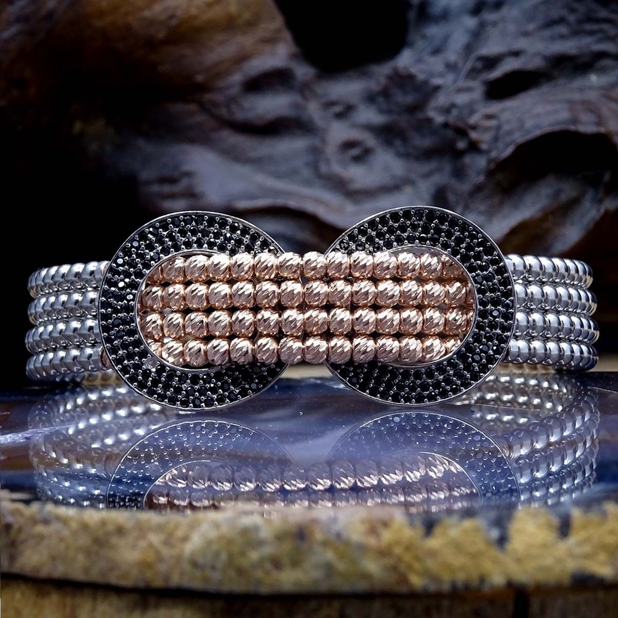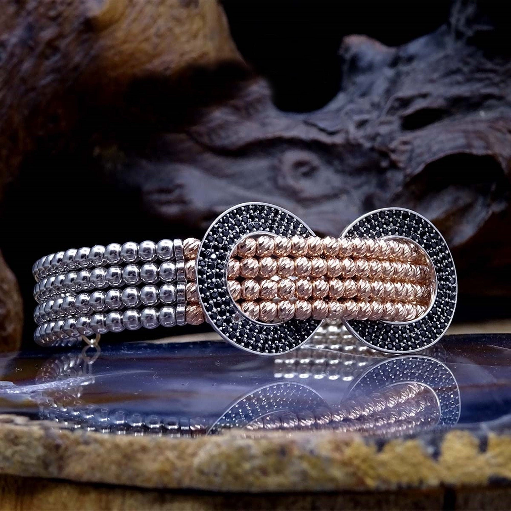 ✧Four rows of dorica, women's silver bracelet with a special black stones embroidered infinity sign motif